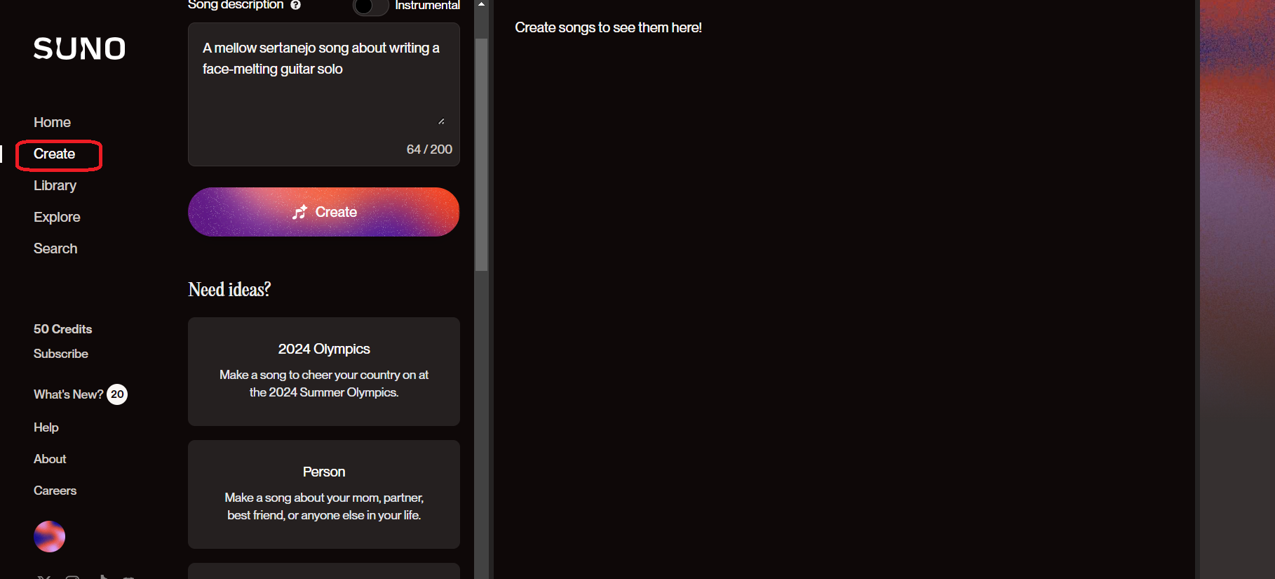 Create를 누르면 두 곡이 만들어 짐을 볼 수 있습니다. 음악만 만들어질 때도 있고 사람의 음성이 들어간 것도 있습니다.