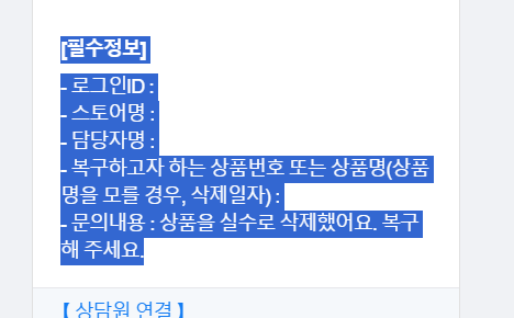 저는 오늘 삭제한 제품이 없어서 네이버 톡톡 상담으로 복구하기를 신청했습니다.