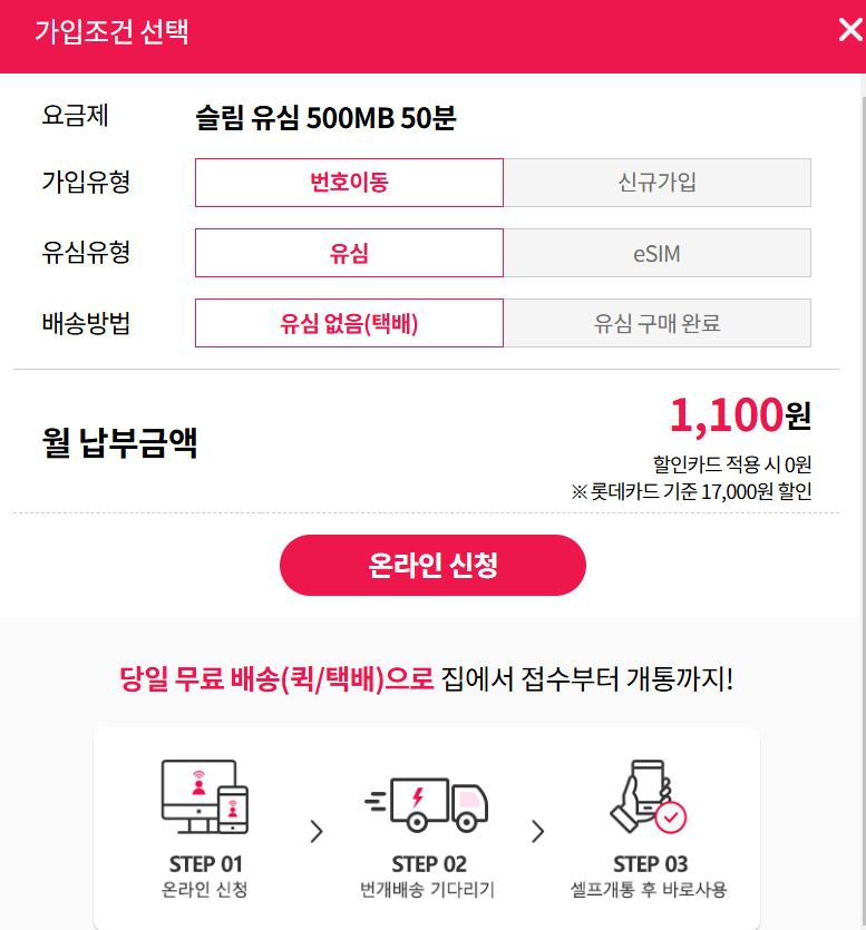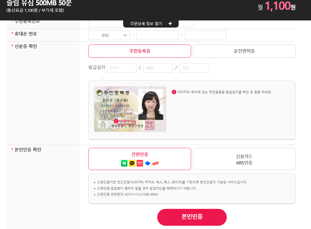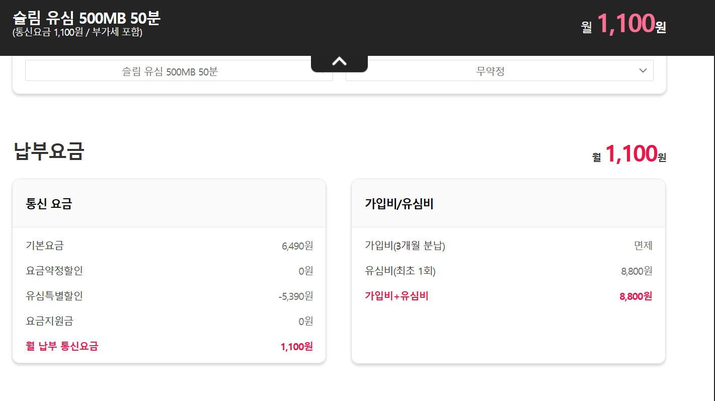 예를 들어 초슬림 요금제 1100원을 선택하시면