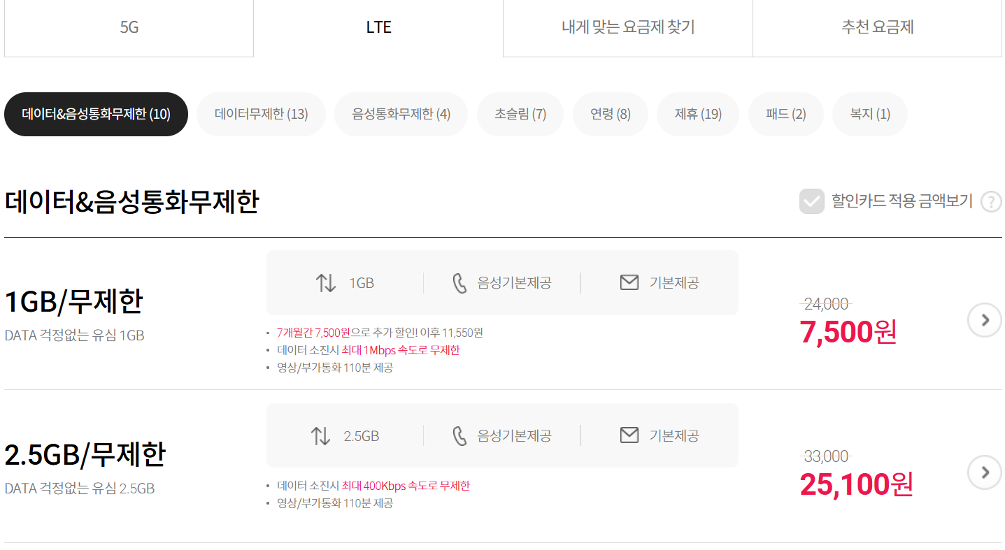 요금제가 아주 다양합니다. 정말 잘 안 쓰시는 분은 초슬림 요금제로 월 1100원의 통신비로 이용할 수 있습니다.