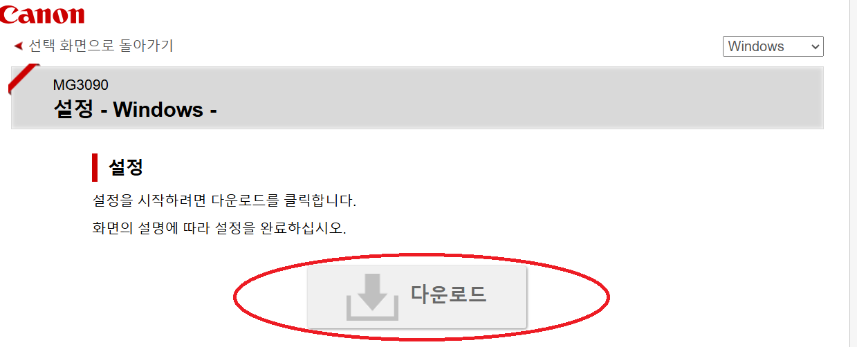 8. 설정버튼을 누르고 모델을 입력하고 검색하니 MG3095W인 데 찾을 수 없다는 문구가 떠서 MG를 먼저 적으니 아래로 나타난 모델중 비슷한 3090을 클릭하고 설치를 진행했습니다.