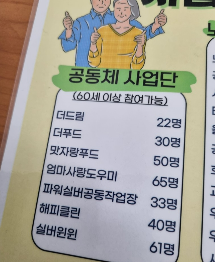 활동내용 : 노노케어, 취약계층지원, 공공시설 봉사, 경륜전수 활동