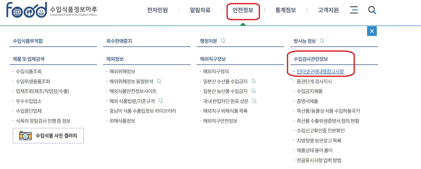 수입식품 정보마루 -> 안전정보-> 수입검사관련정보->인터넷구매대행참고사항