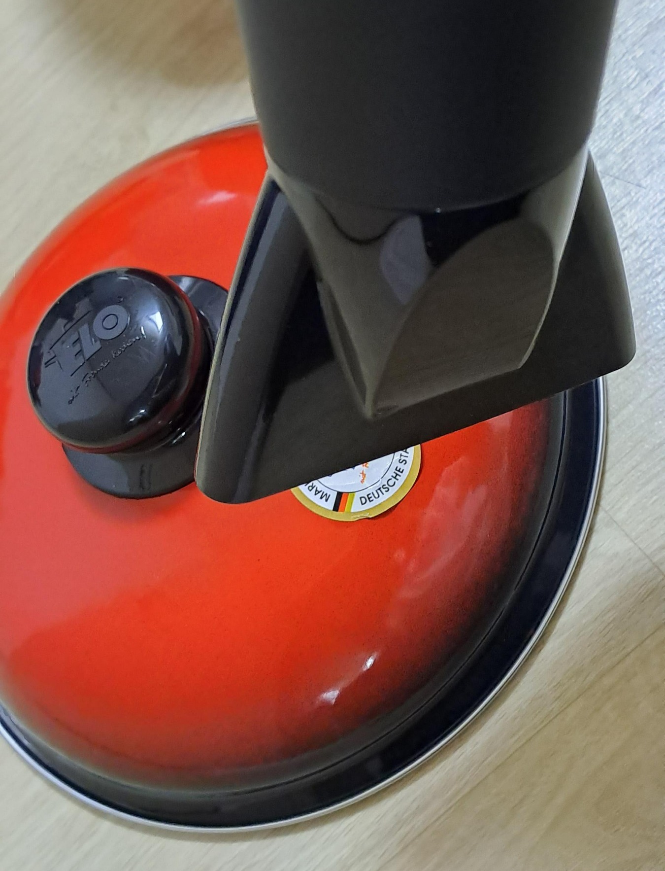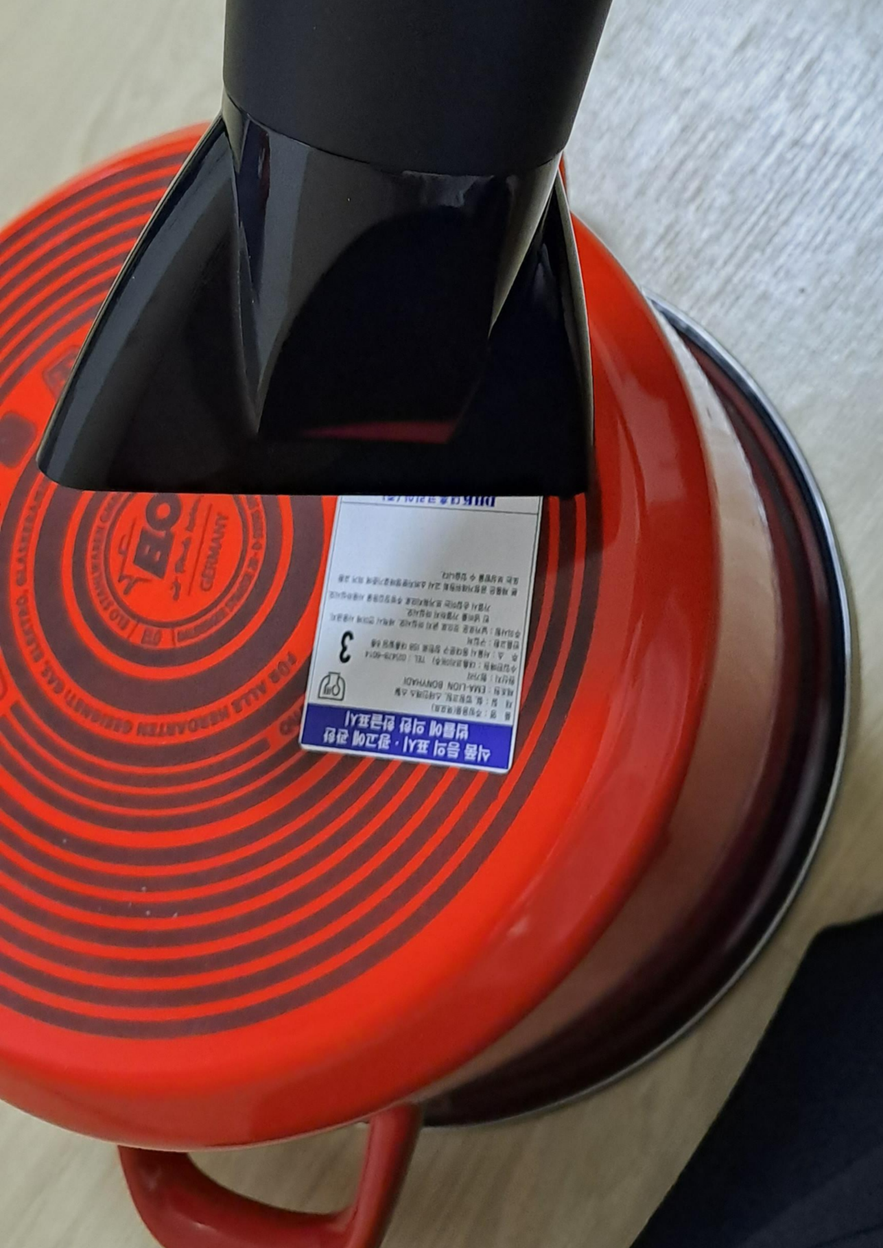 오랜만에 주방에서 쓸 ELO 빨간 법랑냄비를 구입했습니다. 그런데 뚜껑과 냄비 바닥의 스티커가 손으로 뜯으니 잘 뜯어지지 않아 난감했습니다. 그래서 몇 년 전 라벨을 떼어낼 때 뜨거운 바람을 쐬어주어 깔끔하게 떼어내는 것을 본 게 기억이 나서 드라이기를 사용하여 떼어보았습니다.
